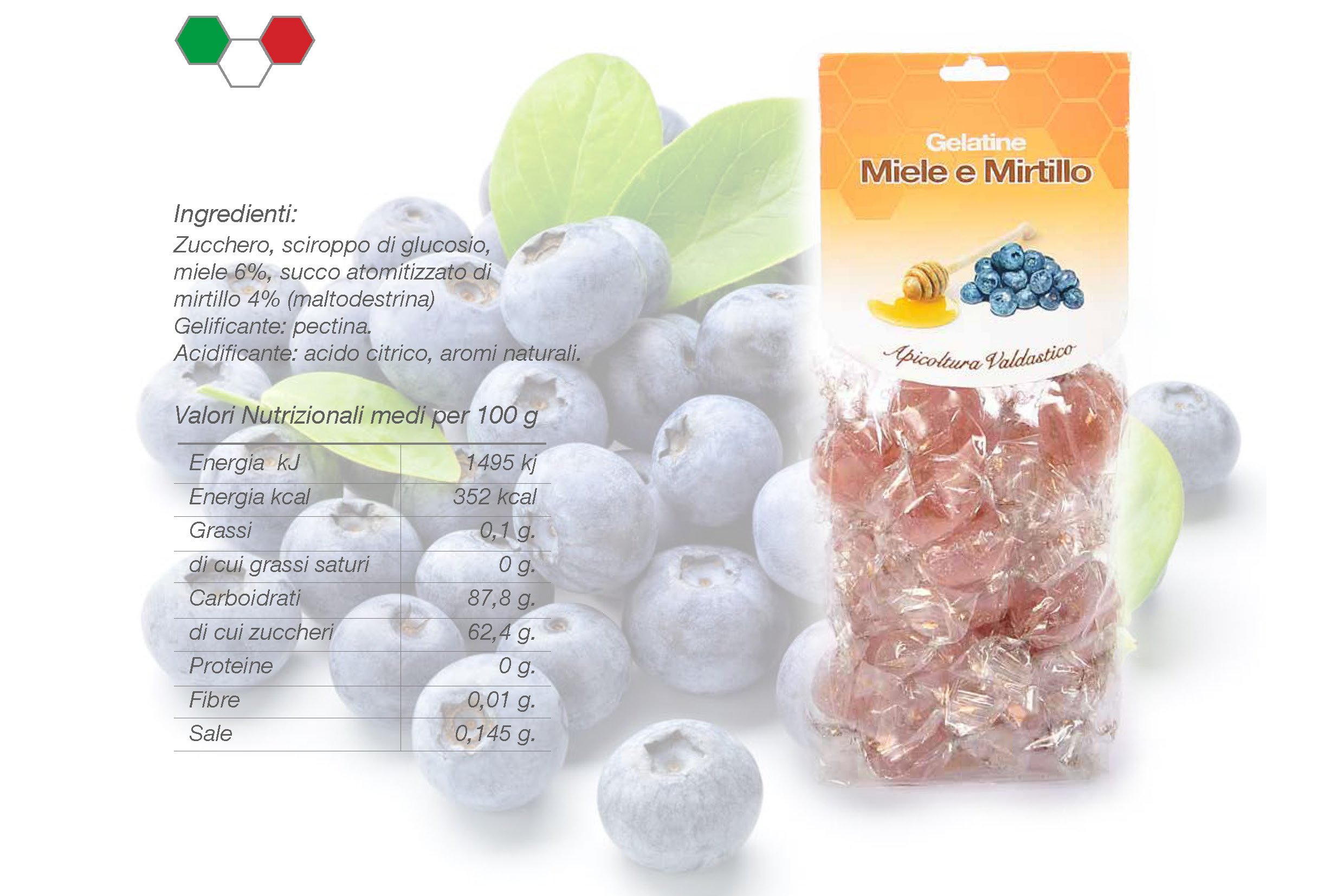 miele 6%, succo atomitizzato di mirtillo 4% (maltodestrina)