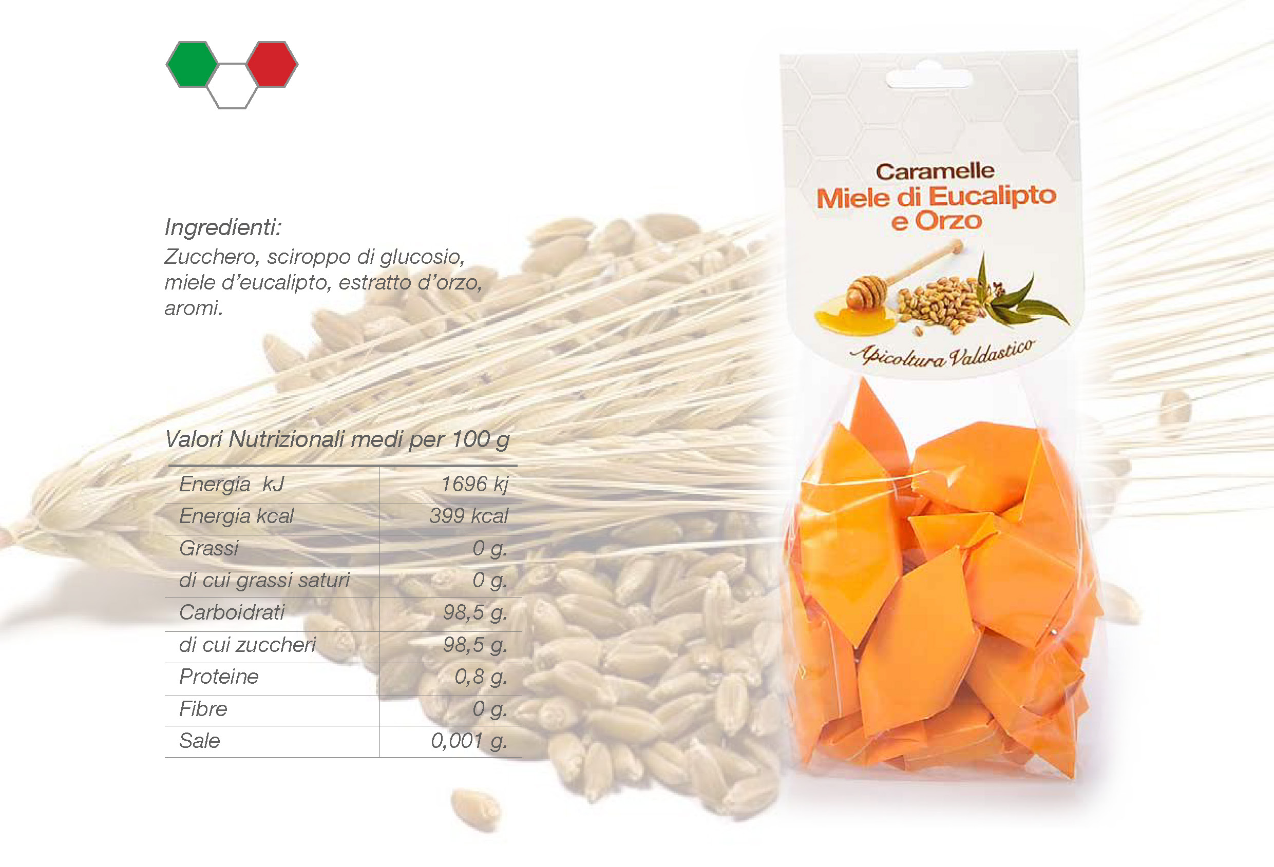 miele d’eucalipto, estratto d’orzo, aromi.Valori Nutrizionali medi per 100 g