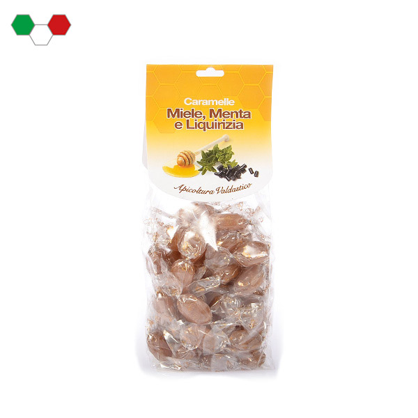 Caramelle incartate alla menta e liquirizia con ripieno di dolcissimo miele.