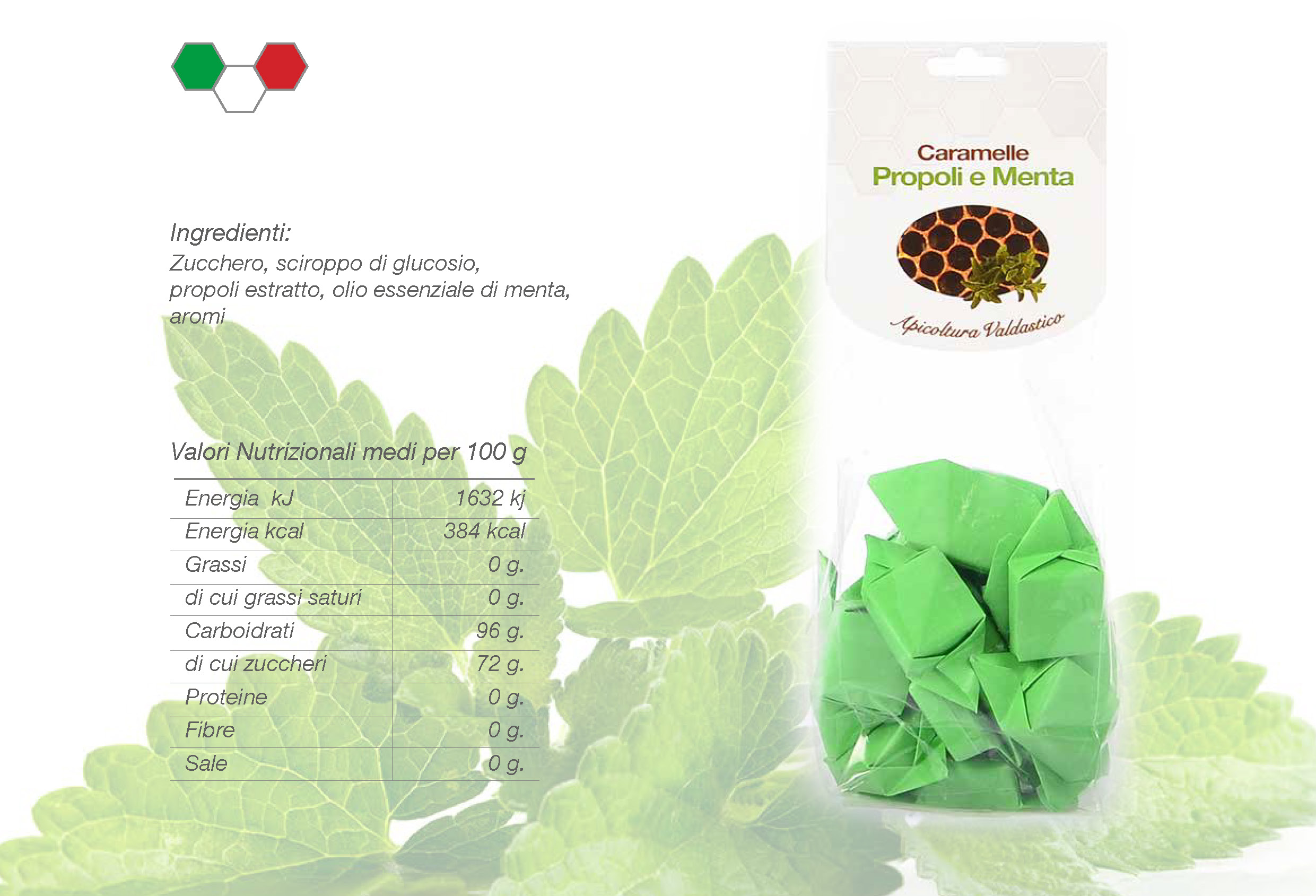propoli estratto, olio essenziale di menta, aromi.Valori Nutrizionali medi per 100 g