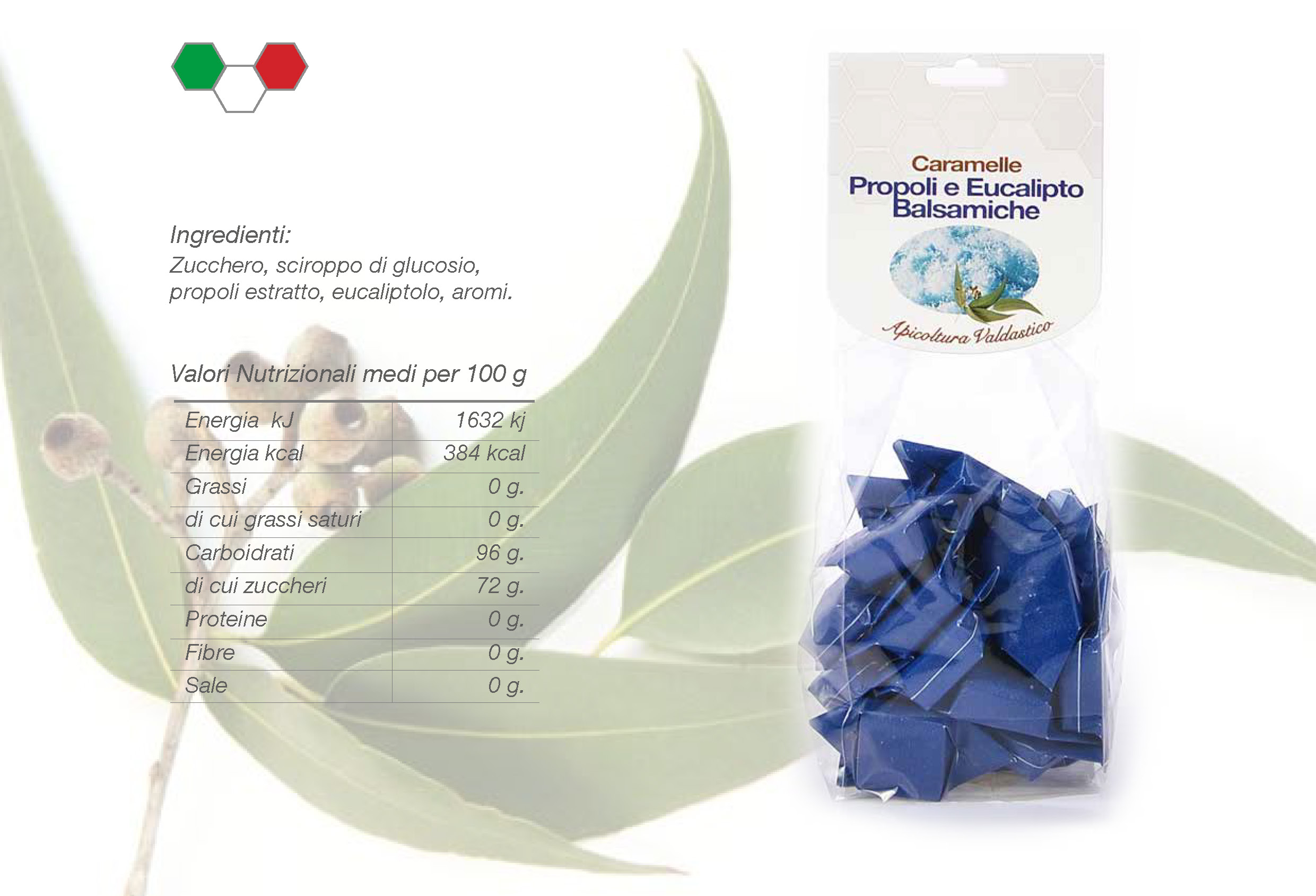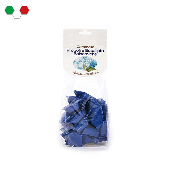 Caramelle incartate dal gusto eucalipto con propoli.