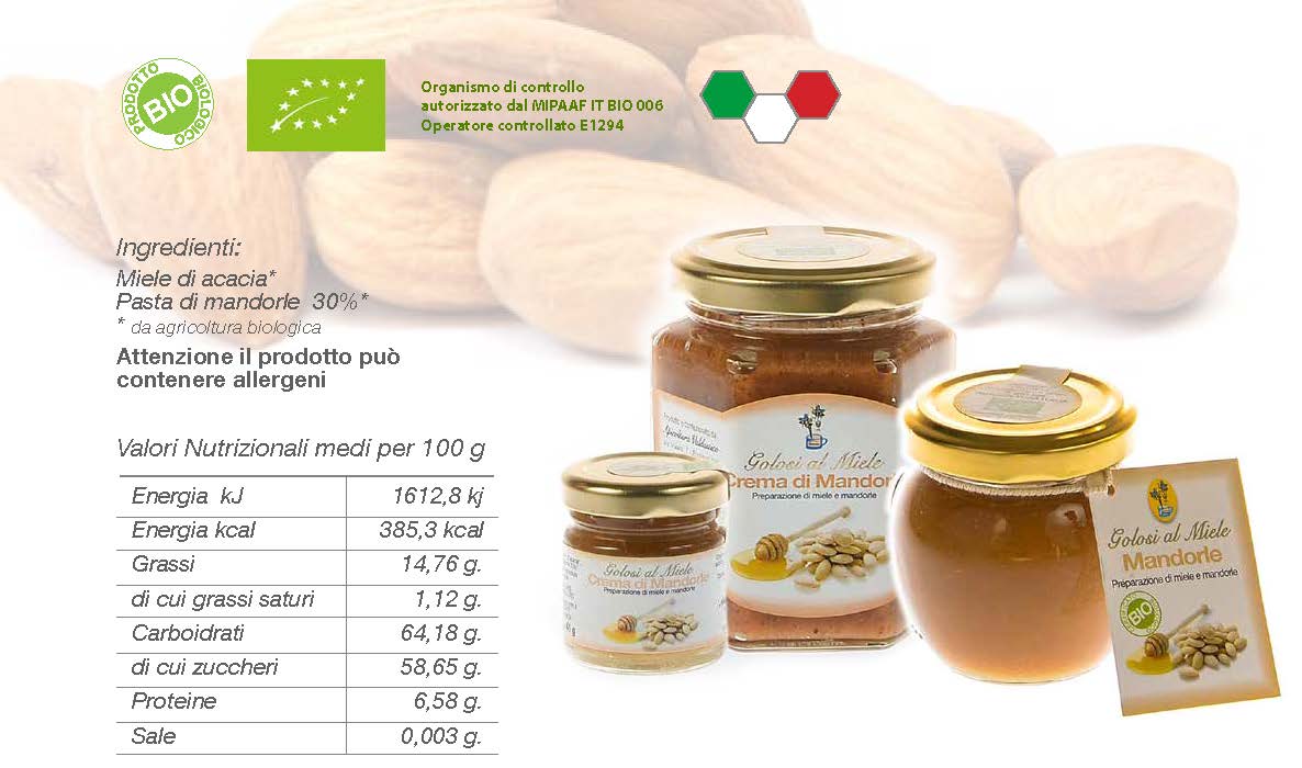 Le migliori mandorle italiane ed il miele di acacia più pregiato prodotto da apicoltura biologica per questa autentica golosità senza l’aggiunta di grassi, coloranti e conservanti. Le mandorle sono ricche di vitamine del gruppo B1 e B2, vitamina E, magnesio, ferro e calcio. Spalmata sul pane o fette biscottate, è una colazione energetica e nutriente.