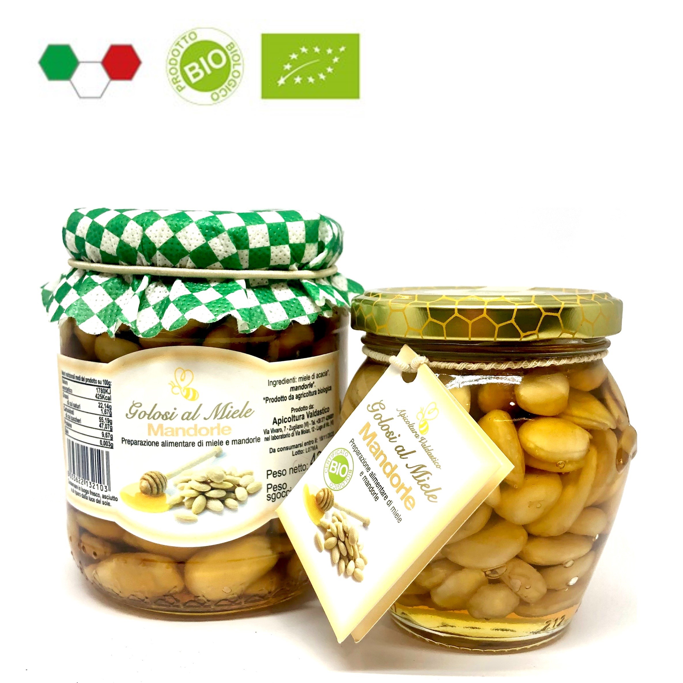 Prelibatezza che abbina alla fragranza della mandorle intere pelate di prima scelta, la dolcezza e le proprietà benefiche del miele di acacia prodotti da agricoltura biologica. Si ha così un prodotto altamente energetico che soddisfa i desideri della gola e dà un forte apporto energetico. E’ un prodotto indicato per chi fa sport ed anche per chi si sottopone ad un forte logorio psicofisico oppure da offrire agli invitati o da consumare nell’intimità della famiglia. Originale ed apprezzata anche come idea regalo.
