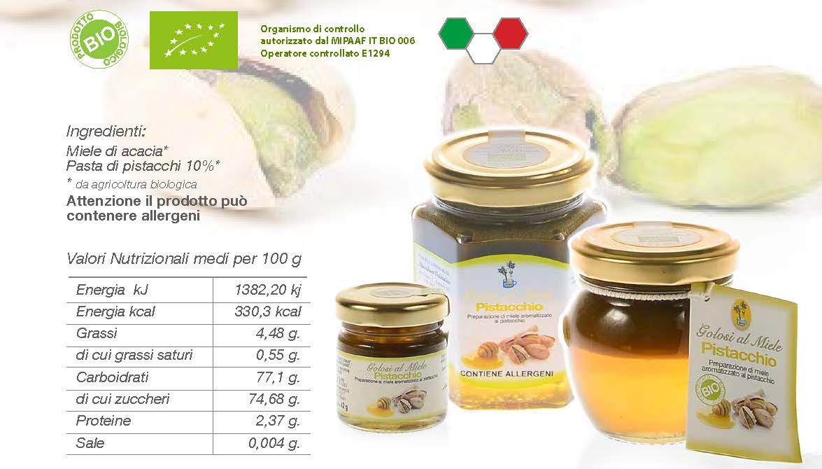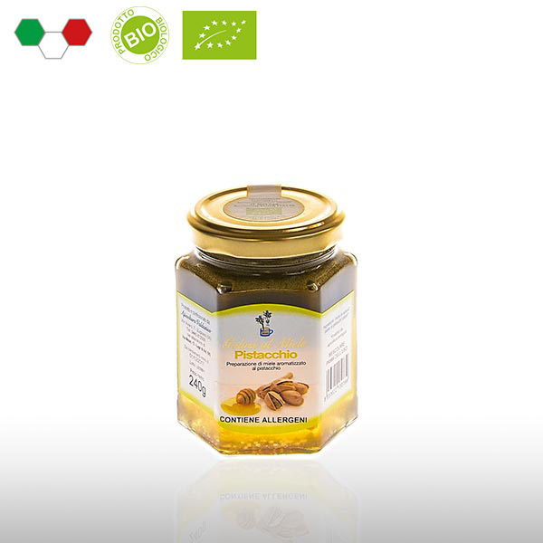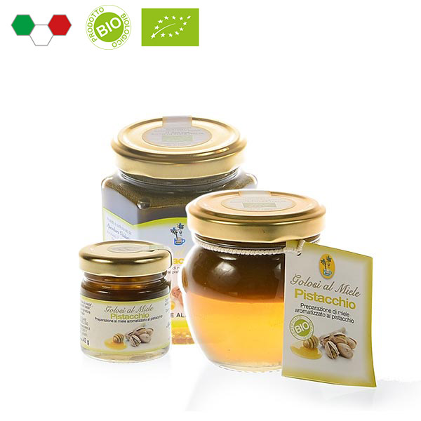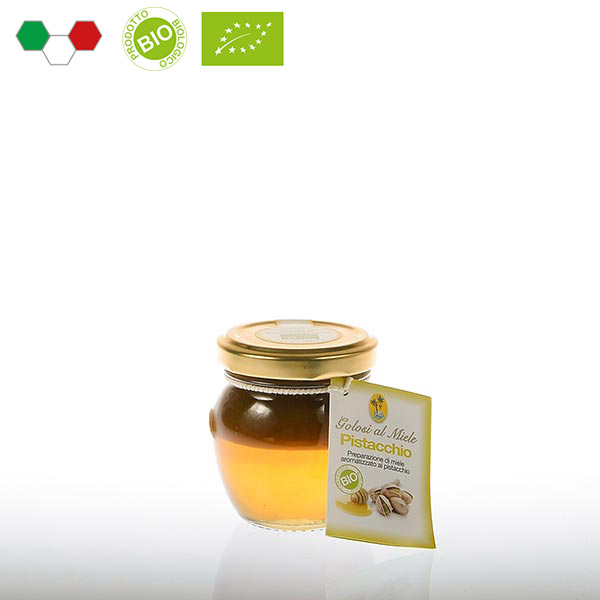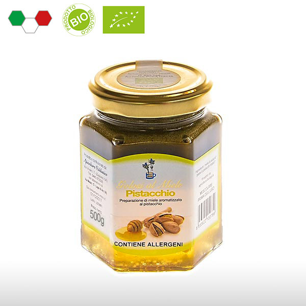 Pasta di pistacchio aggiunta al miele di acacia più pregiato prodotti da agricoltura biologica. Un sorprendente incontro tra dolce e salato per una golosità tutta da scoprire. Spalmata sul pane o fette biscottate, è ottima come colazione e merenda. Piace anche a chi non ama il miele! Originale ed apprezzata anche come idea regalo.