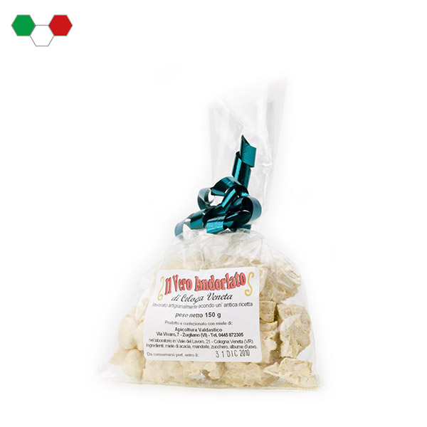 Il vero e originale mandorlato di Cologna Veneta, lavorato secondo un’antica ricetta artigianale con miele di acacia di nostra produzione e mandorle di prima qualità. Si scioglie in bocca! (disponibile da ottobre ad aprile).