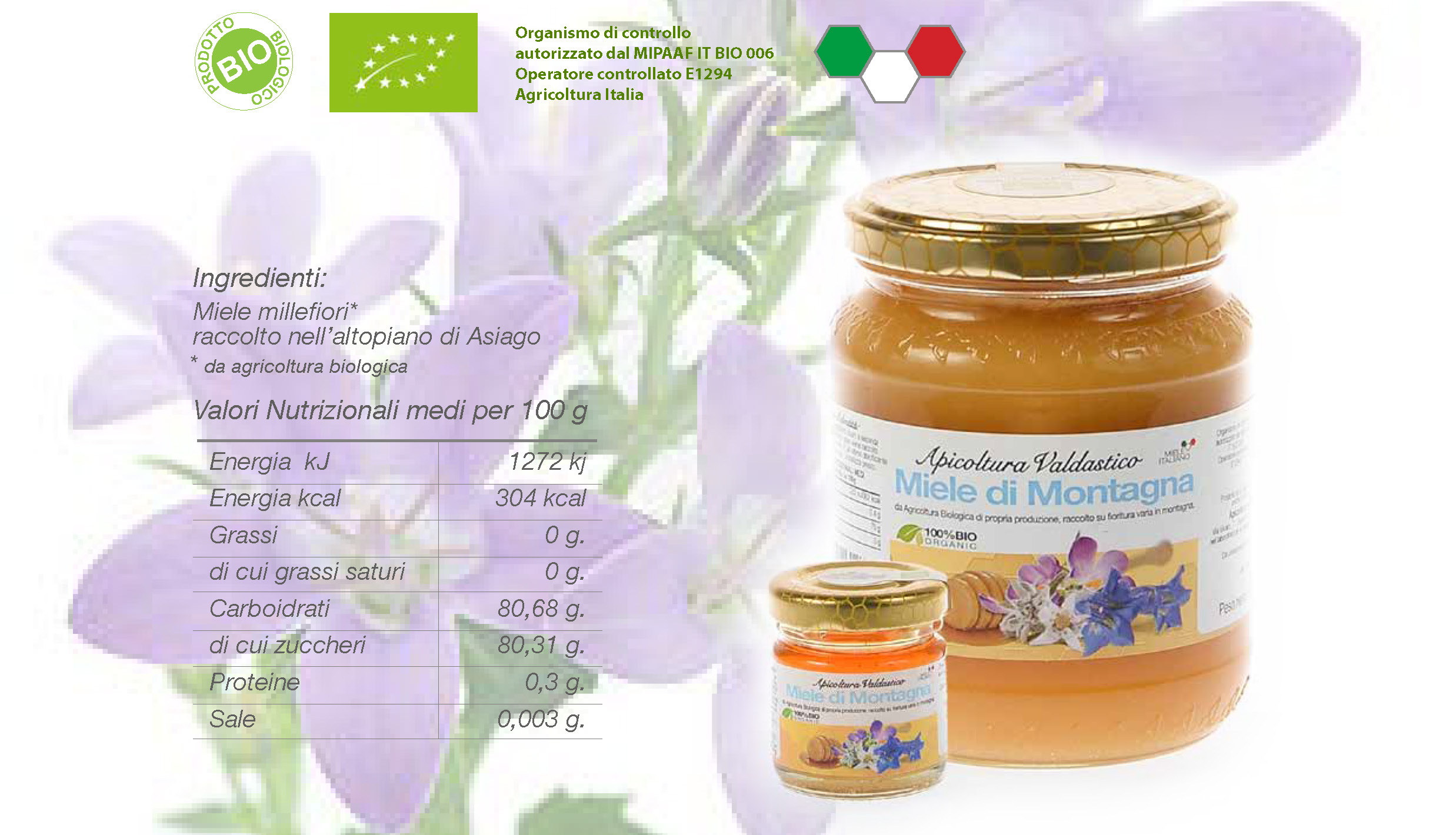 Prodotto da apicoltura biologica. Dal colore giallo oro al bruno scuro a seconda delle annate e dei pascoli dove viene raccolto il nettare. Sapore gradevole. È un ottimo dolcificante per ogni tipo di bevanda. Cristallizza velocemente.