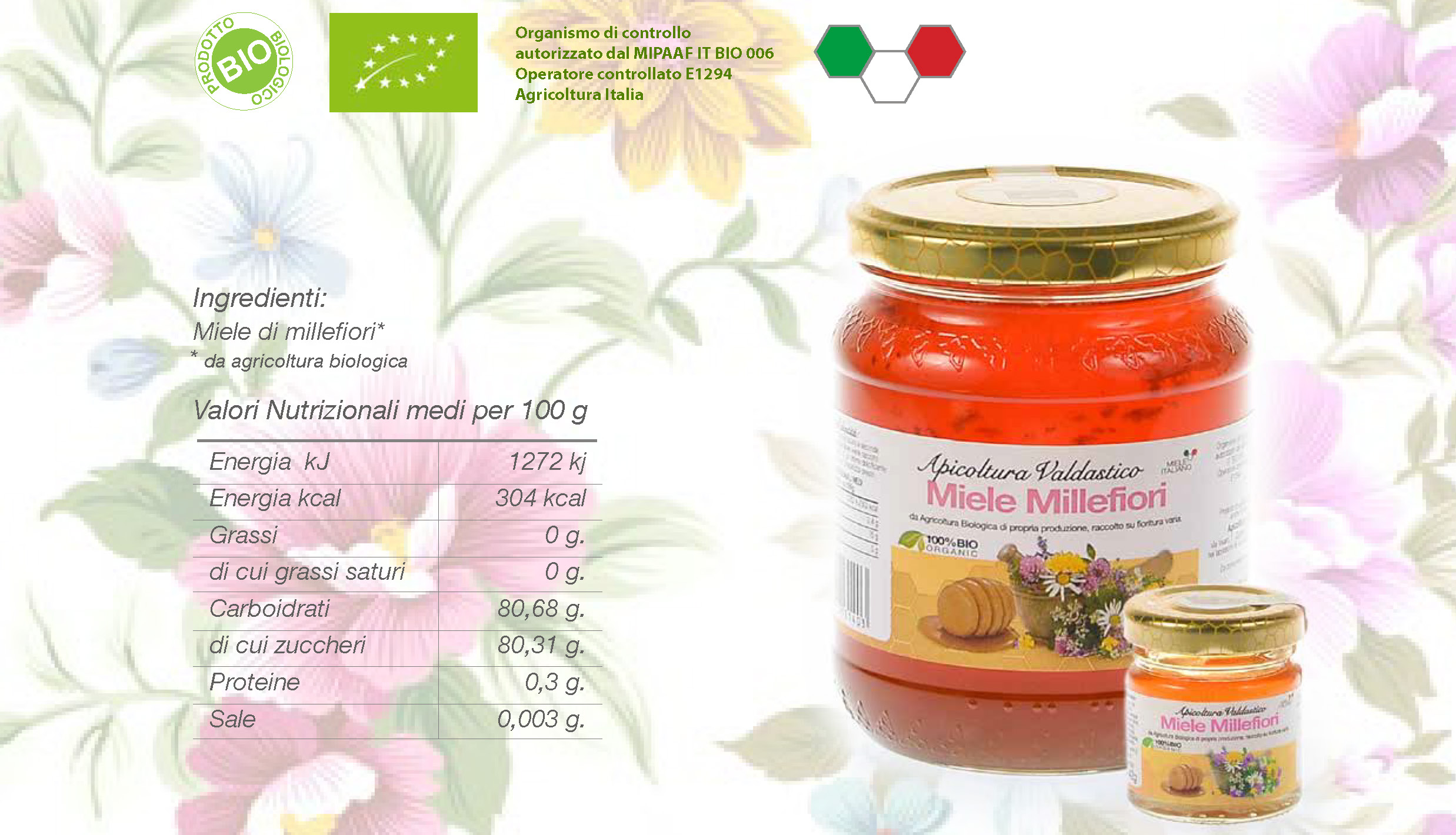 Prodotto da apicoltura biologica. Dal colore giallo oro al bruno scuro a seconda delle annate e dei pascoli dove viene raccolto il nettare. Sapore gradevole. È un ottimo dolcificante per ogni tipo di bevanda. Cristallizza velocemente.